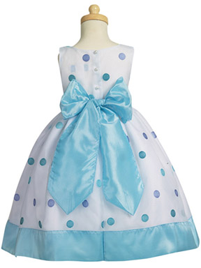 This pretty little polka dot dress has embroidered polka dots in different shades. It is a sleeveless, tea length dress with a tie back sash and button back closure. The attached crinoline slip adds fullness. Made in the USA