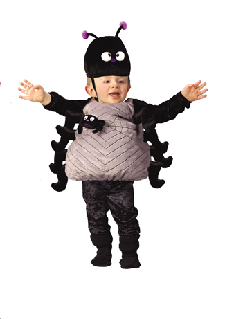 This little spider is adorable! Includes padded, spiderweb- stitched vest with spider-head styled headpiece. One size fits most infants up to 24 months. Polyester.