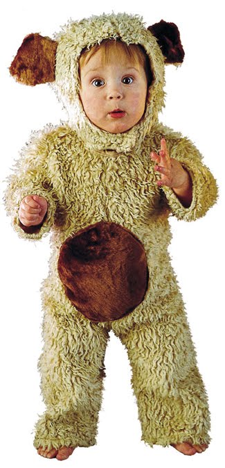 This loveable huggable little cutie includes- curly plush jumpsuit with plush fur tummy and matching hood. Acrylic. Toddler 12-18 months.