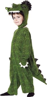 Fuzzy polyester jumpsuit with plush dinosaur head sitting on top of attached hood. Features zipper front and elastic cuffs. Fits most children size 3 to 4.