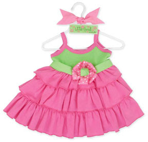 Soft fabric and bright colors make this little dress a fun summer addition to any little girl's wardrobe. The little sprout sundress is made of 100% cotton super soft rib knit. Dress has bright green spaghetti strap top, and 3 rows of soft full pink ruffles make up skirt. A pretty pink polka dot flower attaches to the front on a pretty green ribbon sash that ties in back. Fits 0-6 Months, made by Mud Pie.