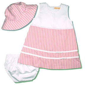 This 100% cotton striped sleeveless dress is pinks and white. There is a zipper in the back with ribbon accents around skirt and cute little ribbon bows. This dress set includes matching sun hat, and bloomers.