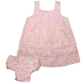 Oh so sweet! Soft calico floral dress of 100% cotton has pretty pink trim on bodice, and sweet little ruffles around skirt. Matching undies included.