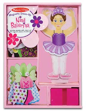 Nina, prima ballerina is ready to perform with grace and beauty in practice tights or bespangled tutu. This set includes a magnetic wooden doll with a wooden stand and lots of colorful and attractive magnetic outfits and accessories for pretend play!