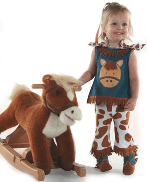 Sweet little horsie play set is one of a kind. Denim blue little top with faux suede fringe around the hem and neckline. Matching horse spotted pants with faux suede fringe around bottom of pant legs. A very cute set! Size 0-6M. Boots not included.