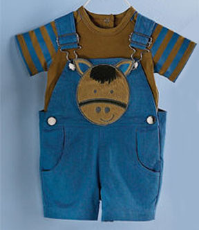 Horse overalls set includes blue overalls with appliqué horse face on front, and sporty sleeve stripe tee. Fits 0-6M