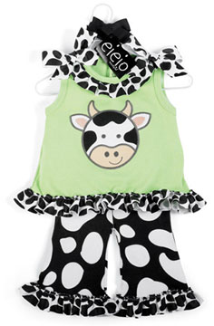 Sweet little cow play set is one of a kind. Pale green little top with cow print ribbon ruffles around the hem and neckline. Matching black pants with white cow spots and ribbon ruffles around bottom of pant legs. A very cute set! Size 0-6M.