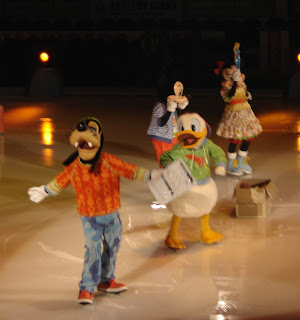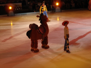 We went to see Disney Toy Story 3 on Ice over the weekend. It was such a good show. It was dark in there so my pictures are not worth a flip, but I will post a few anyway. I went with my daughter, two grandchildren, and my sister-in-law and nephew. Of course the tickets were expensive, and there was no special prices for the kids. Cotton candy was $12.00 a piece. Popcorn was $4.00 a bucket. I'm not sure how much the drinks were, but we got 6 of them.