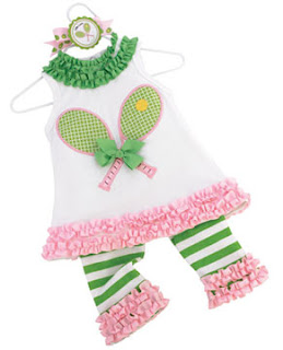 2-piece set includes striped leggings, a tennis appliqué tunic, and yards of grosgrain ribbon for the ruffles.