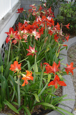 Originally I purchased three packages of three different color amaryllis flowers. Each package had three bulbs. So I started off with nine bulbs. When I dug them up to move them to this flower bed I had about 50 bulbs. This year 50 flowering stalks came up and bloomed at once. There are still more stalks coming up! I live in SW Florida, and have these planted on the NE side of the house.